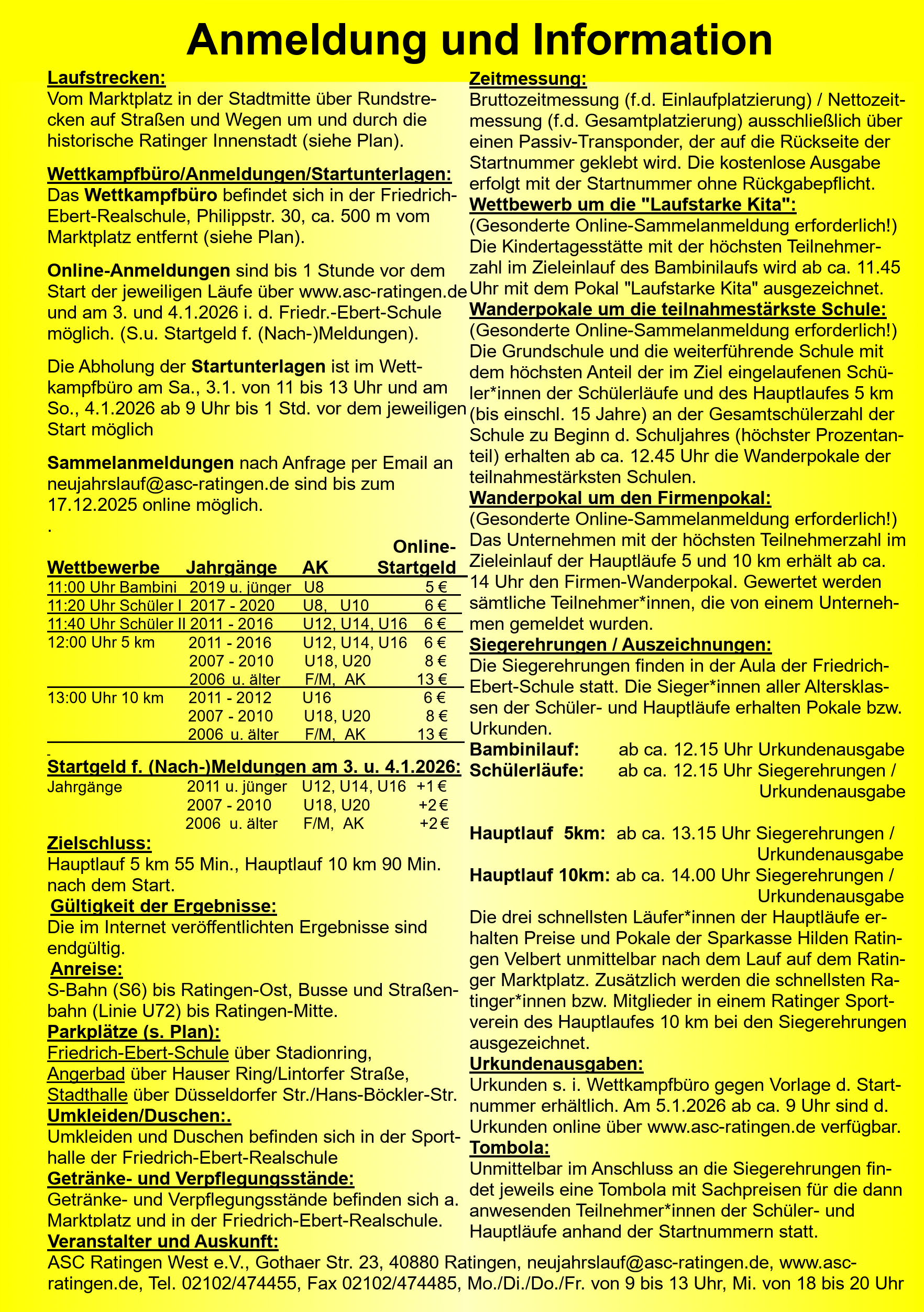 Traditionell veranstaltet der ASC an jedem ersten Sonntag im neuen Jahr seinen Neujahrslauf. Dort gehen bis zu 2000 kleine und große Läufer auf einen Rundkurs um den Ratinger Marktplatz. Auf den Bambini-Lauf bereitet der ASC Kinder verschiedener Kindertagesstätten vor, damit sie 500 Meter durchhalten. Bei den Schülerläufen werden nicht nur die Sieger geehrt, sondern auch die Schule, die mit den meisten Schülern an den Start geht. Das Hauptfeld ambitionierter Sportler und Sportlerinnen, Freizeitsportler und Senioren gehen entweder auf die 5 km Distanz oder nehmen am Hauptlauf auf der 10 km Strecke teil.